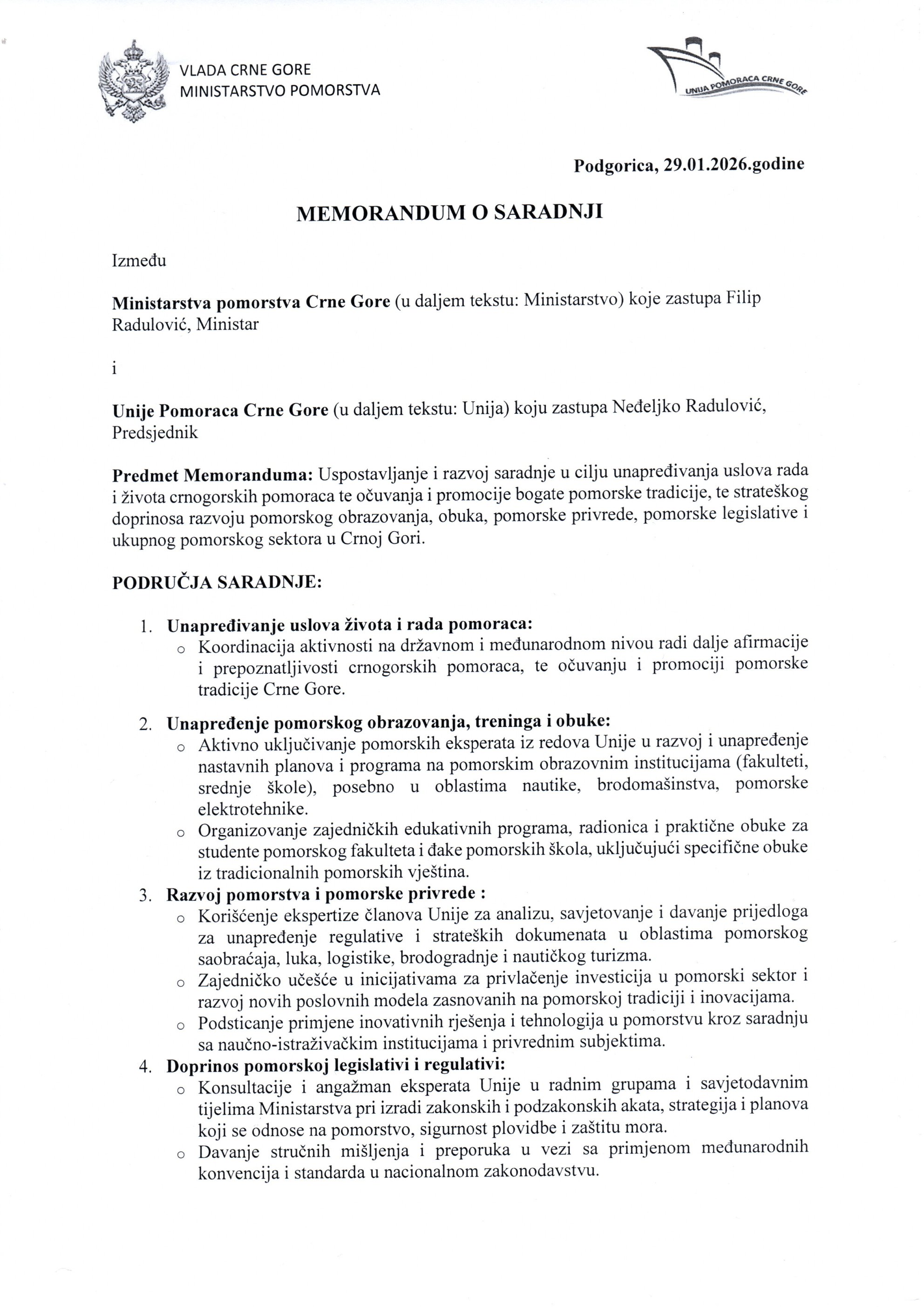 Dana 29.01.2026. u Podgorici je potpisan Memorandum o Saradnji sa
